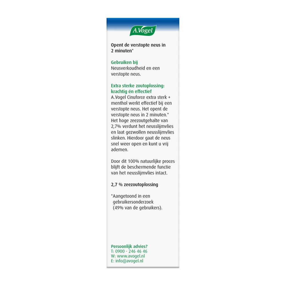 A.Vogel Neusspray Extra Sterk met MentholMedisch hulpmiddel Cinuforce Neusspray Extra Sterk bevat een extra sterke zeezoutoplossing, menthol en eucalyptus. Het hoge zeezoutgehalte van 2,7% verdunt het neusslijm en laat gezwollen neusslijmvlies slinken. Je neus gaat snel weer open, waardoor je vrij ademt. A.Vogel Neusspray Extra Sterk met Mentholwerkt snel en doeltreffend bij neusverkoudheid, een verstopte neus en loopneus. Cinuforce Neusspray Extra Sterk opent je neus al in 2 minuten*. Krac